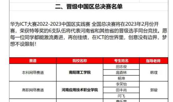本网讯(特约记者/韩璞)近日,我校信息工程学院田志俊、庞森林和杨坤等三名学生通过参加校级初赛和省级决赛,过关斩将层层选拔后,成功受邀参加华为ICT大赛2022-2023中国区实践赛总决赛。按照大赛规则,河南省组委会仅推荐6支队伍参加中国区总决赛,而我院学子作为河南省唯一一支参赛队伍参加中国区决赛本科网络赛道。