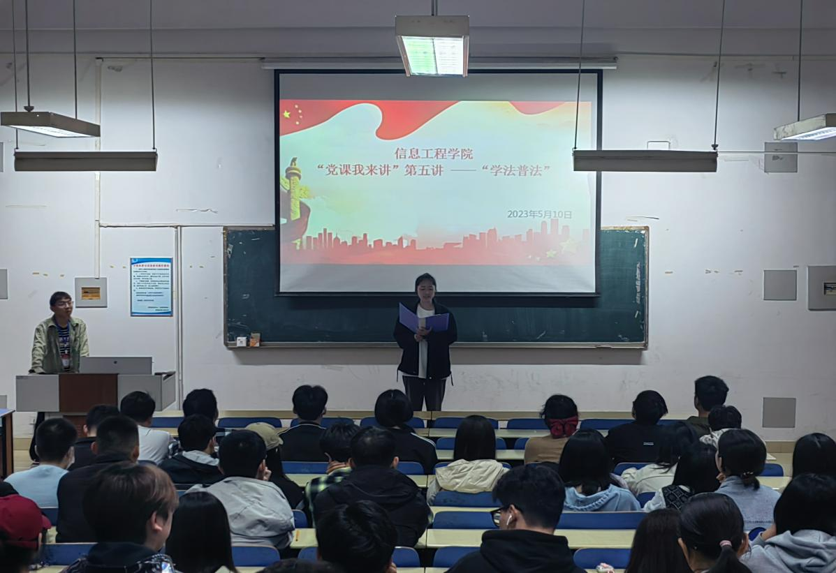 本网讯(学生记者/徐于航)为深入学习贯彻习近平法治思想,加强党员的法治观念,提高师生的自我保护意识。5月10日晚,信息工程学院于14教106教室举行“党课我来讲”第五讲。本次活动是以“心系宪法,共筑法治”为主题的普法宣传党课。组织员郭争领学,学生党员、入党积极分子参加学习。