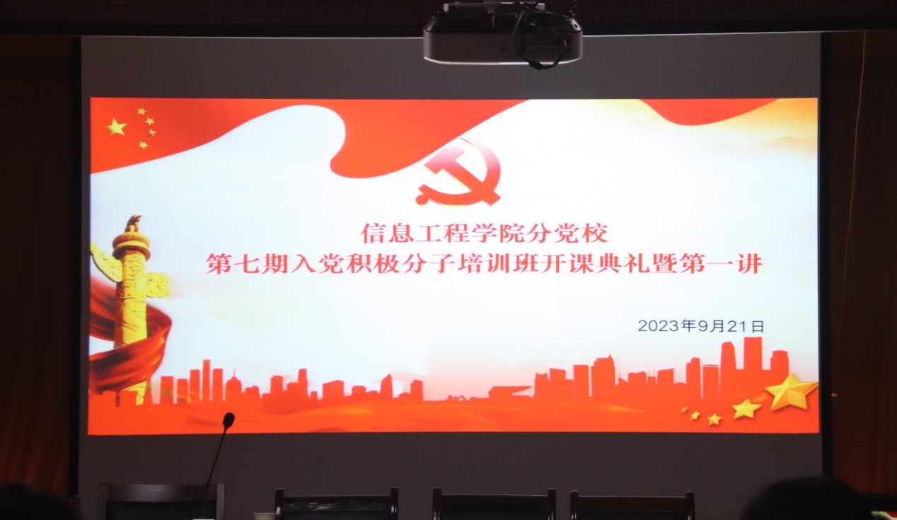 本网讯(学生记者/张兢)9月21日晚,信息工程学院分党校第七期入党积极分子培训班开班典礼暨专题党课第一讲于12号教学楼207教室举行,学院党委副书记白秋阳出席并主持开班典礼,物联网工程教研室主任周荣艳、学院组织员郭争出席,2023秋期全体“团推优”入党积极分子人选参加。