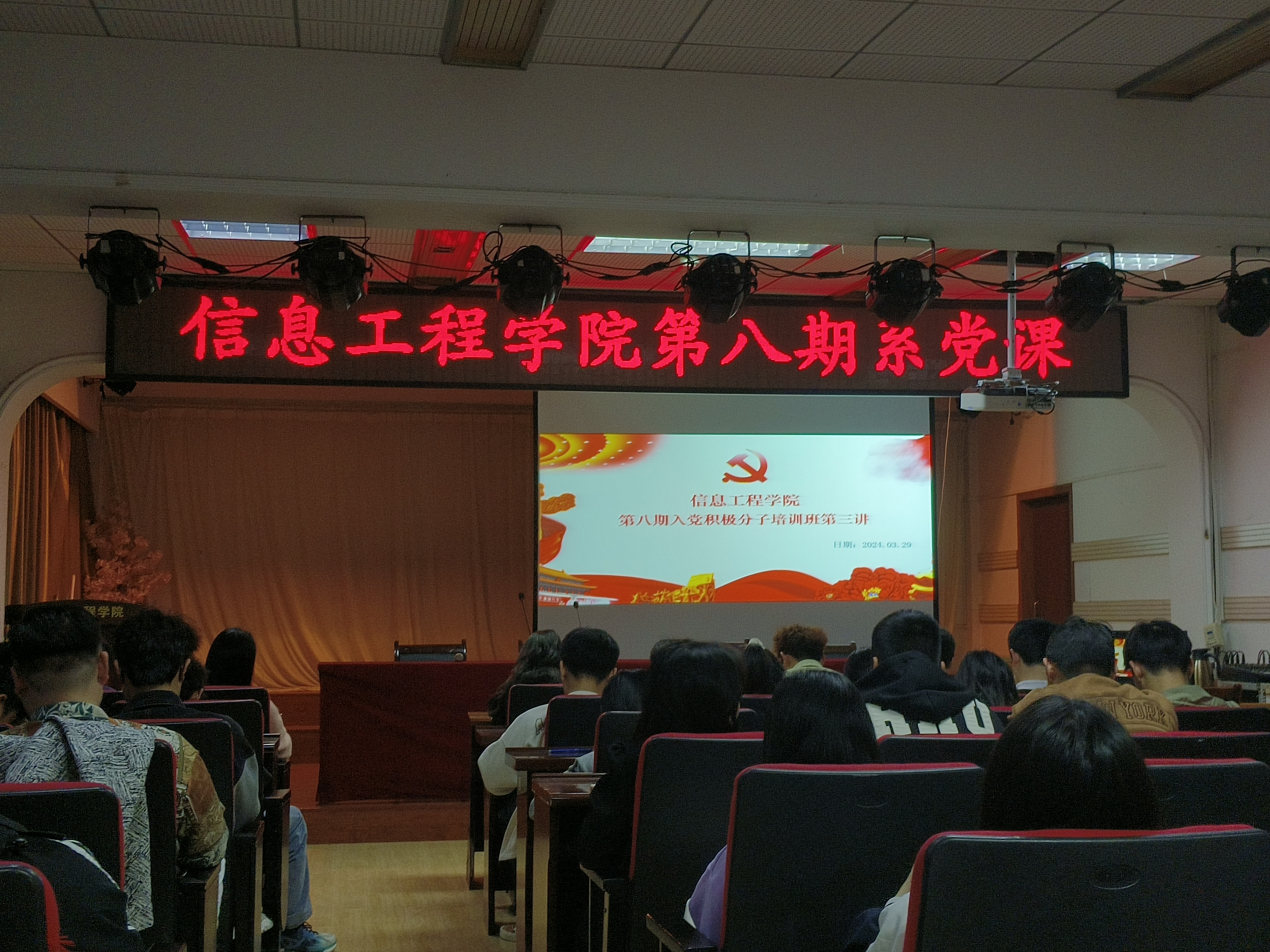 本网讯(学生记者/解怡瑞)3月29日晚,为进一步加强对入党积极分子的思想政治教育,信息工程学院分党校于12教209会议室开展第八期入党积极分子培训班第三讲。本次讲座由学院党员刘宗琛博士出席并担任主讲,信息工程学院第八期入党积极分子参加。