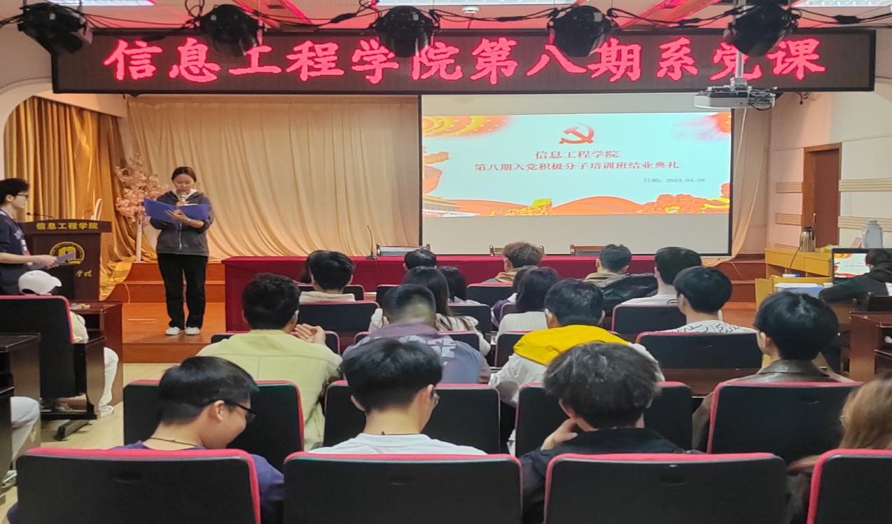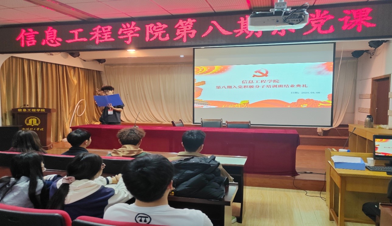 本网讯(学生记者/胡严生)4月8号,信息工程学院分党校第八期入党积极分子培训班结业典礼于12教209会议室举行,全体第八期入党积极分子共59人参加。