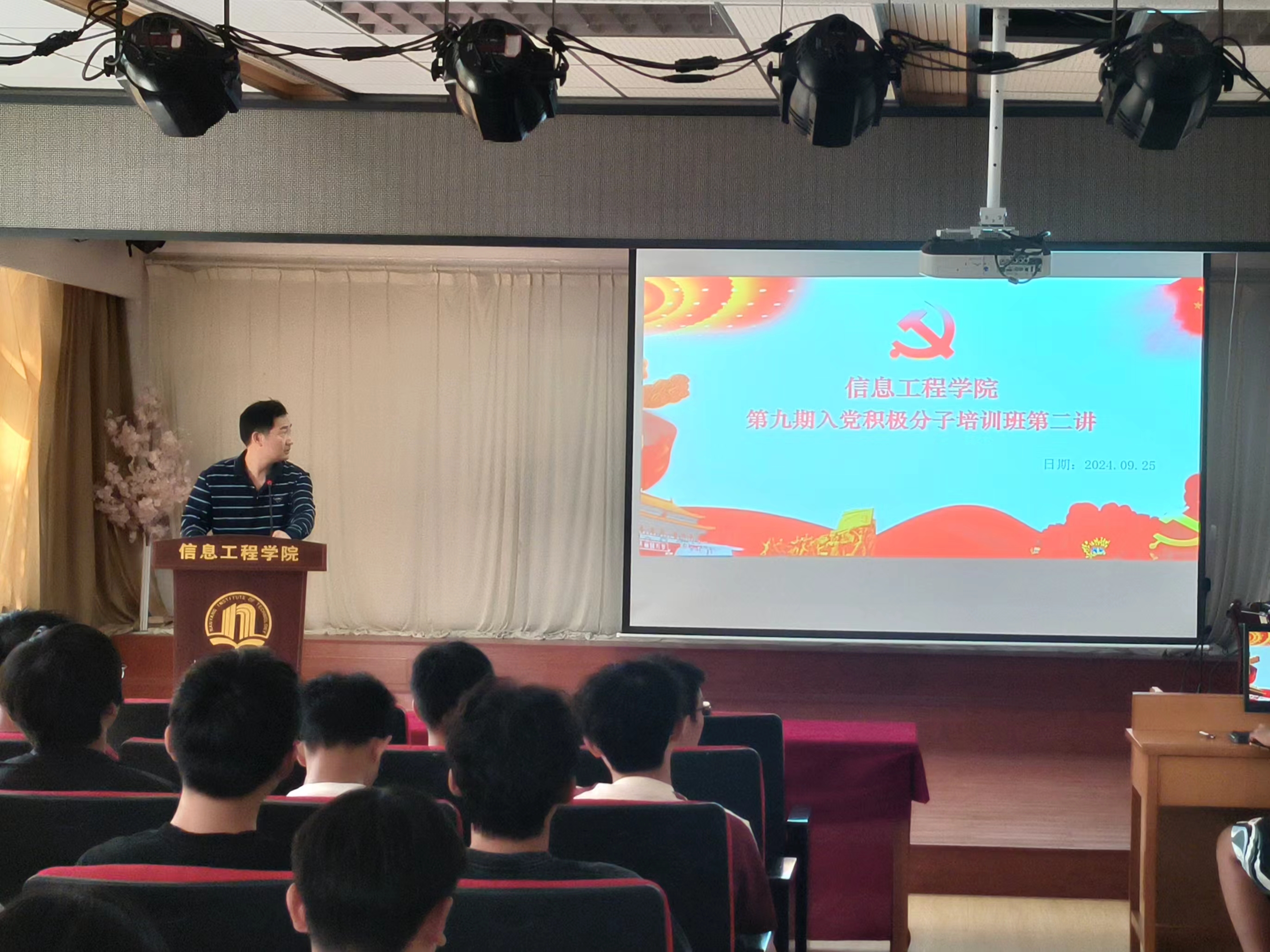 本网讯(学生记者/葛磊)9月25日,为了引导入党积极分子深入学习中国共产党人精神谱系,树立远大理想,信息工程学院分党校于12教209室开展第九期入党积极分子培训第二讲。本次讲座由信息工程学院副院长黄大勇主持,全体第九期入党积极分子参加。
