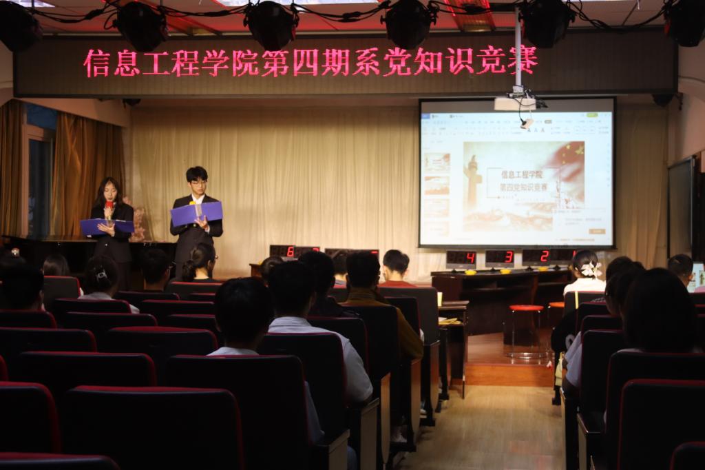 本网讯(学生记者/李彤)4月8日晚,信息工程学院于12教207举办第四期系党知识竞赛信息工程学院组织员郭争老师,学生党建工作站站长武祥栋、熊才源、张成彬出席,25名入党积极分子在现场观看比赛,其他入党积极分子通过网络观看比赛。