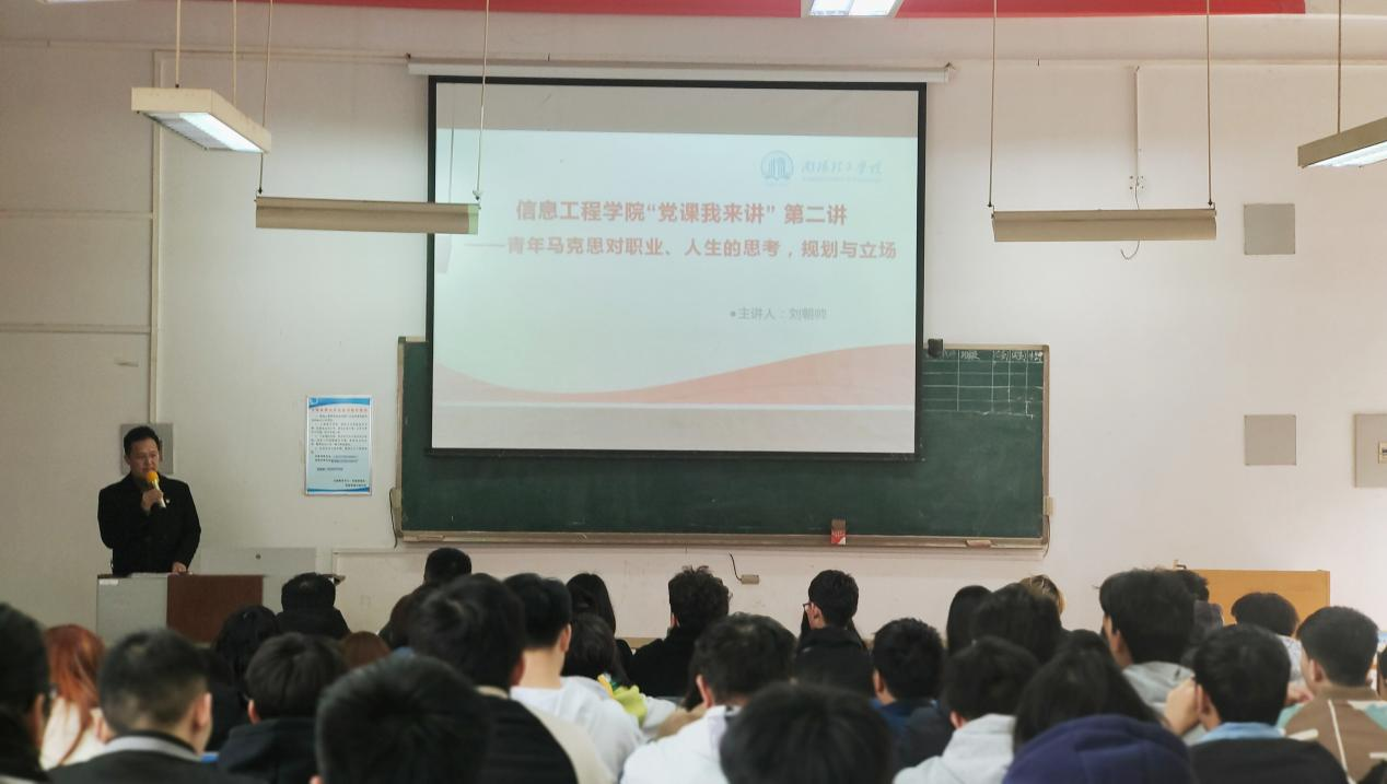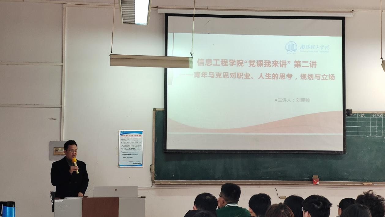 本网讯(学生记者/邵昱昊)3月26日,信息工程学院于14教206教室举行“党课我来讲”第二讲。本次党课主题为“青年马克思对职业的思考、规划与立场”,由华东师范大学马克思主义学院的刘朝帅博士进行授课。信息工程学院学生党员、入党积极分子、青马学堂成员参加学习。
