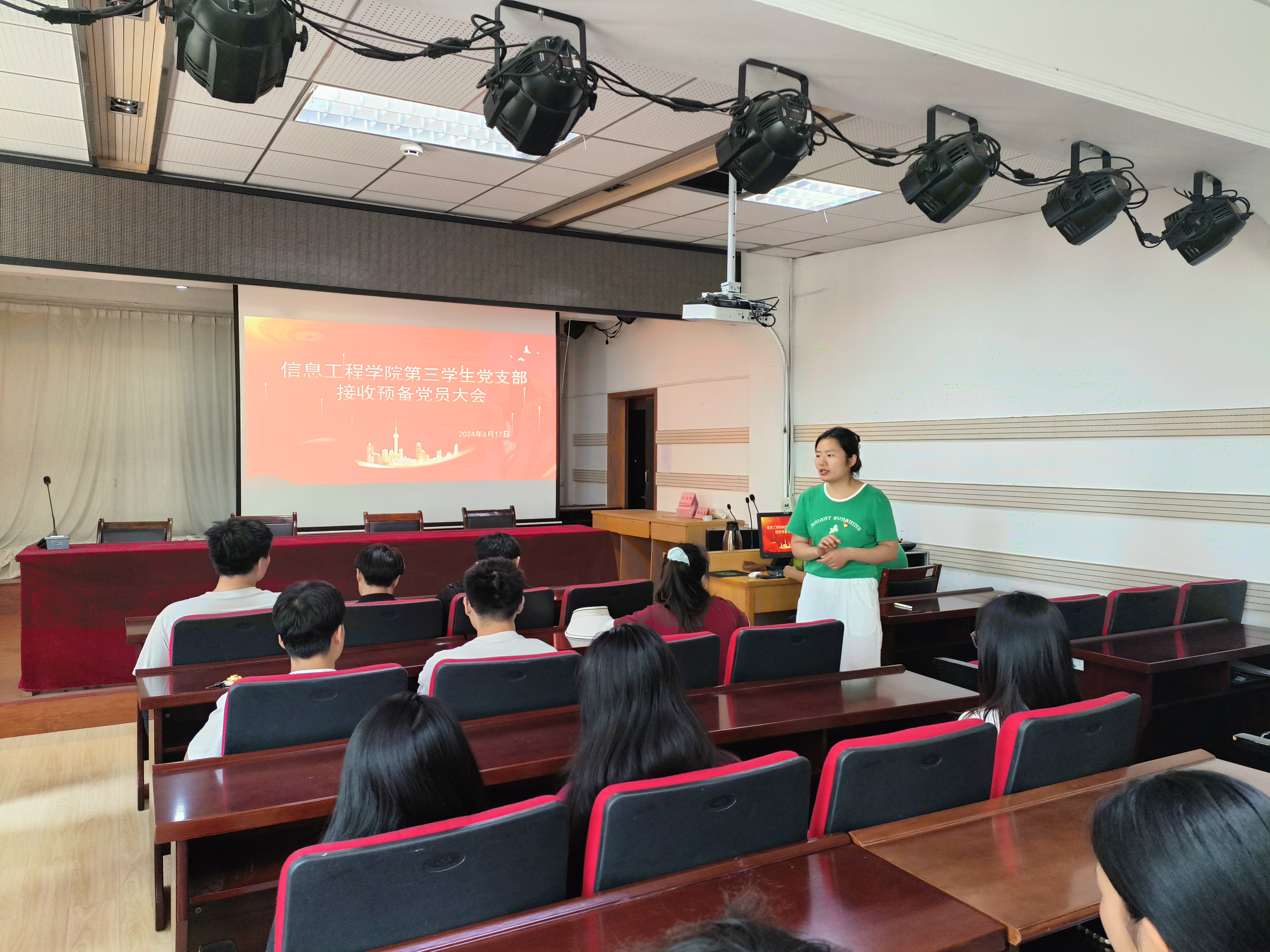 本网讯(学生记者/方培州)6月17日,信息工程学院各学生党支部分别于12号教学楼216、209教室召开接收预备党员大会,学院第一学生党支部书记郭争、第二学生党支部书记关阳、第三学生党支部书记张露出席并主持各支部会议,学院全体学生党员参加会议。